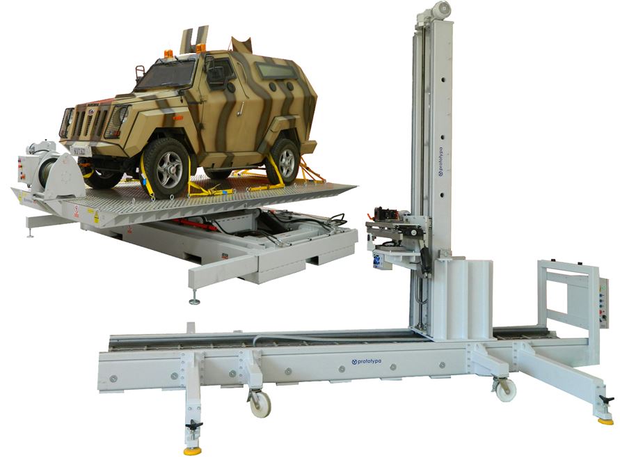 PROTOTYPA GM1 Moving Gun Table and Vehicle Manipulator is convenient equipment for evaluation of protection level of armoured vehicles (AEP-55) Level 1 and 4. GM1 platform is equipped by recoil system. On recoil system is possible fix UZ-2002 Universal Ballistic Breech or adapter for fixing small arms up to calibre 12,7mm. Equipment makes it possible to aim weapons and fire at vehicle under requested conditions of AEP-55.