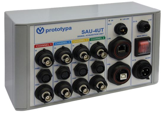 PROTOTYPA SAU-4UT Signal Acquisition Unit with Programmable Trigger Outputs is a device intended for digitizing of analogue signals from sensors and triggering of following measurement and recording devices. The typical application is triggering of a high-speed camera or flash-light for taking photograph of projectile.